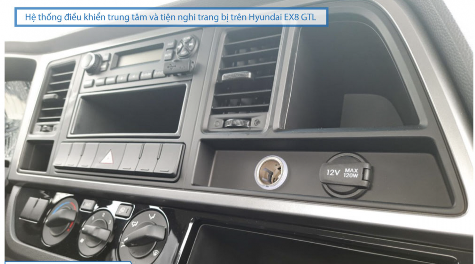 Xe Mighty EX8 GTL còn được trang bị hệ thống các tính năng giải trí kết nối Radio, Aux, USB thông minh, được đặt ở vị trí trung tâm bảng taplo.