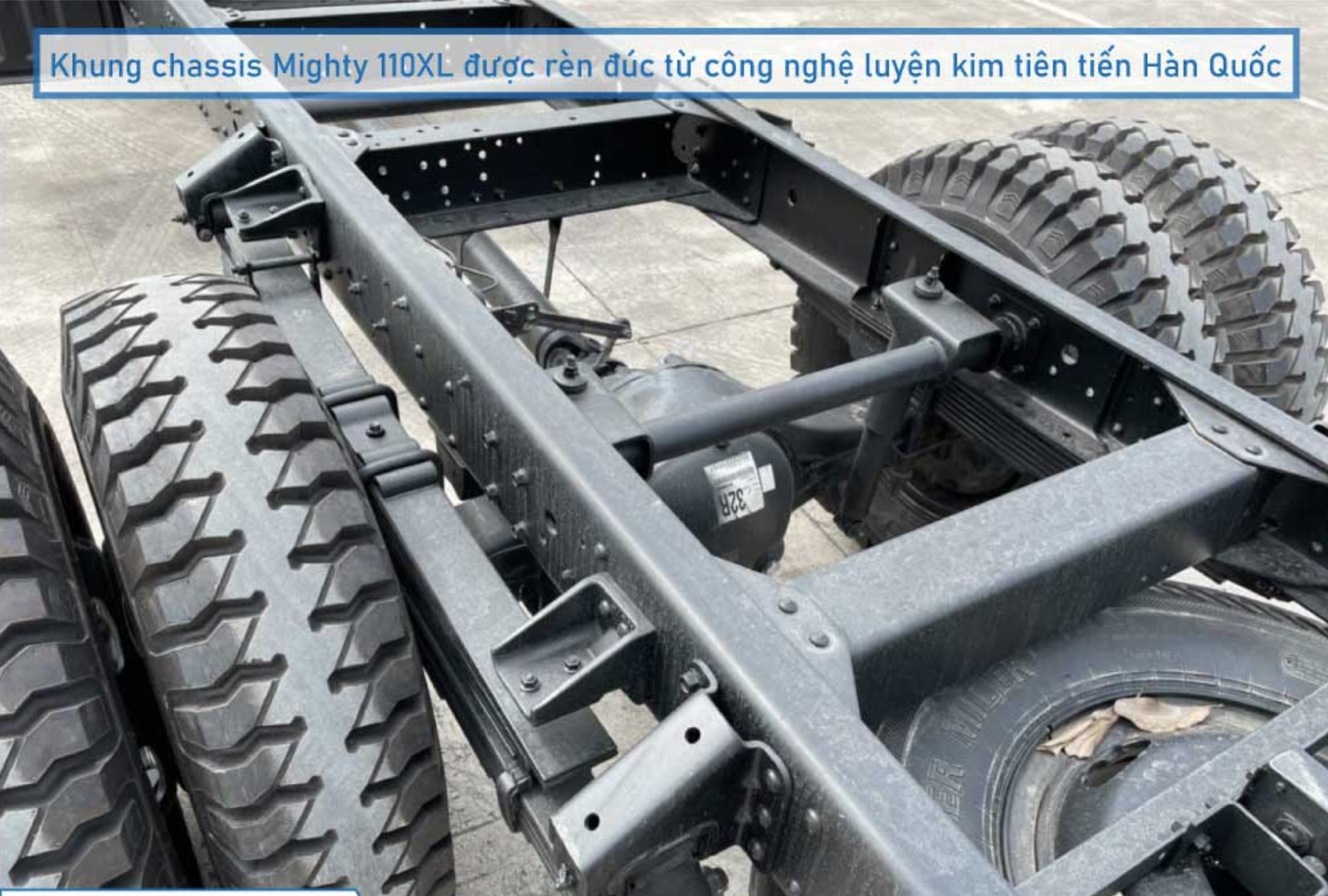 Riêng với phiên bản 110XL thùng dài 6m3 này, thì chassi là cực kì quan trọng. Vì thùng dài, tải lại cao. Chính vì thế nhà máy Hyundai đã nhập khẩu trực tiếp chassi Hyundai Hàn Quốc về, chiều dài tới 6m3, độ dày 6mm, cao 120 mm.