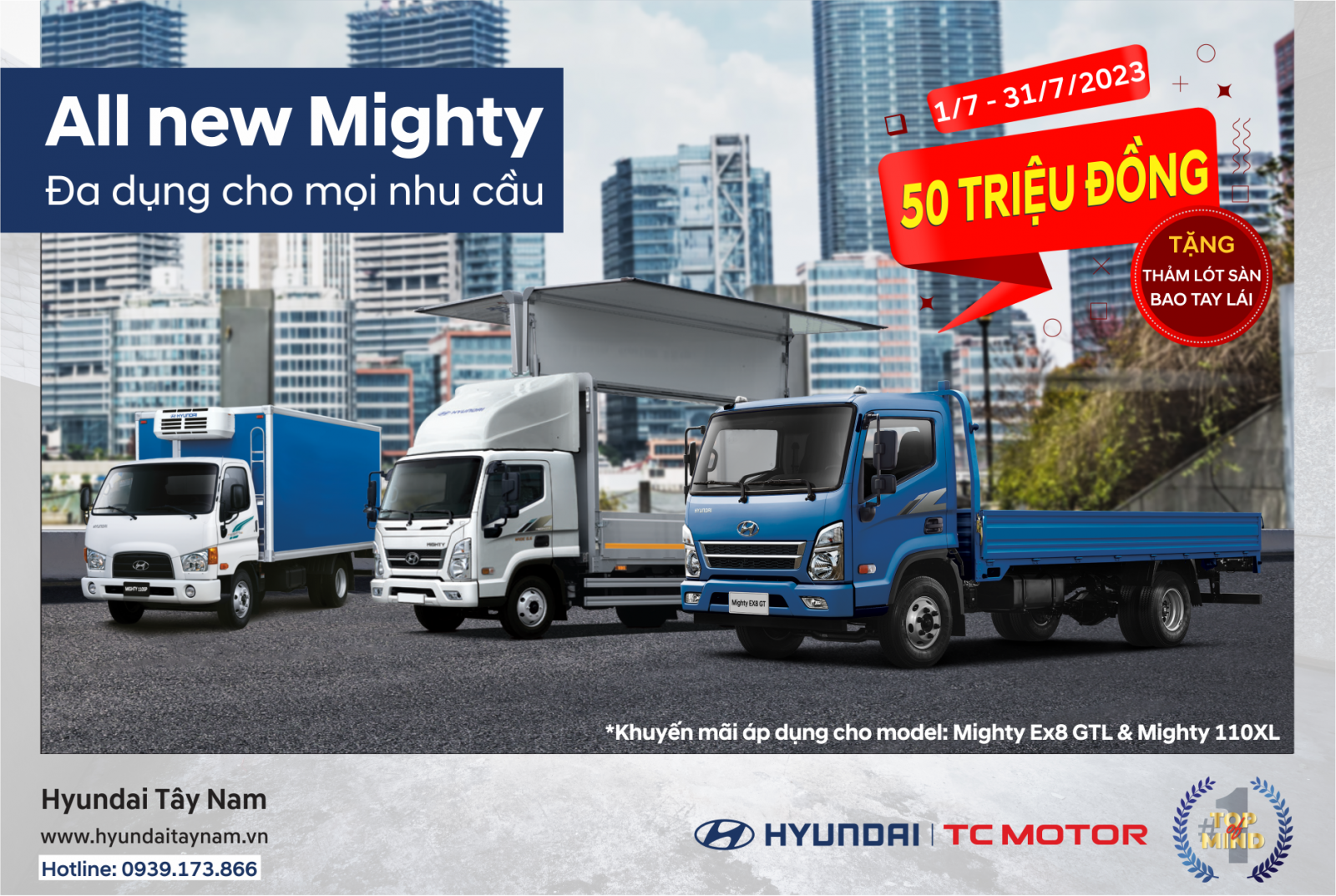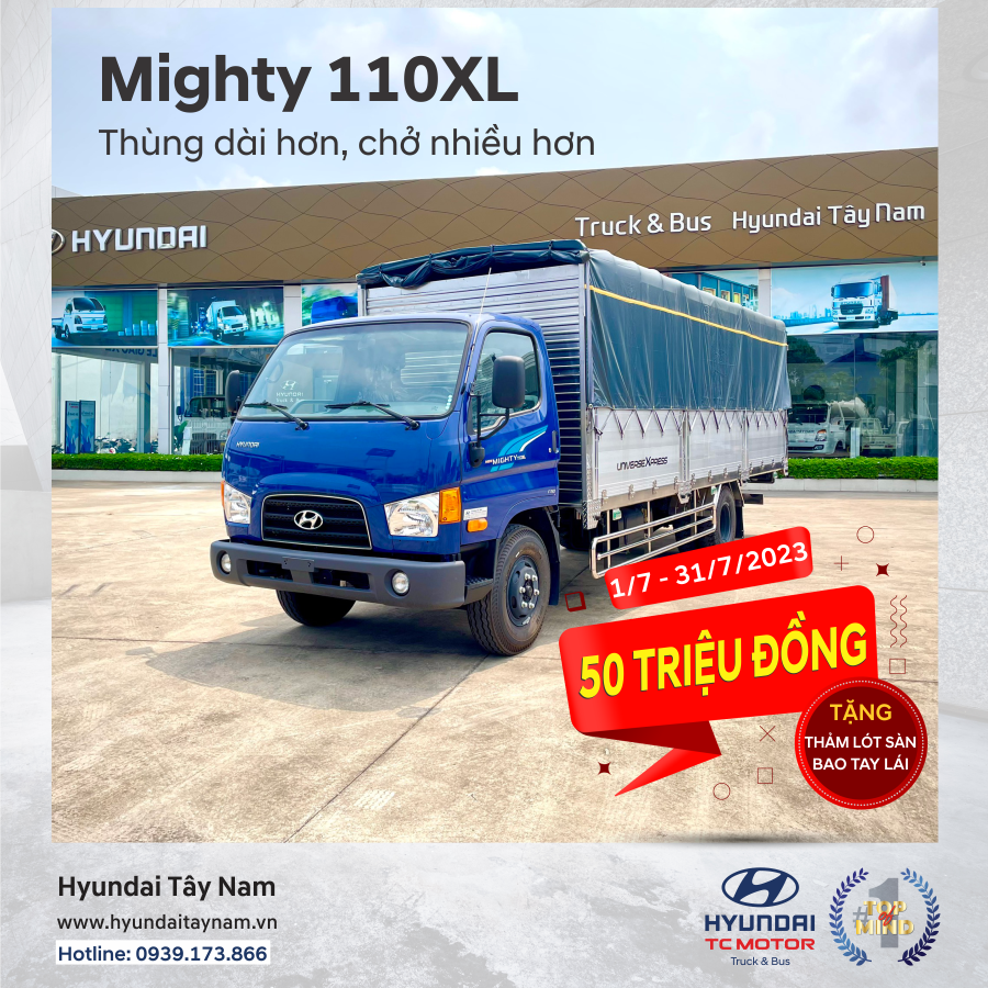 Từ ngày 01/07/2023 đến ngày 31/07/2023, Khi mua dòng xe Mighty 110XL hoặc Ex8 GTL tại Hyundai Tây Nam, quý khách hàng sẽ nhận được khuyến mãi trị giá 50.000.000 VNĐ và tặng kèm 2 món phụ kiện ( thảm lót sàn và bao da tay lái)