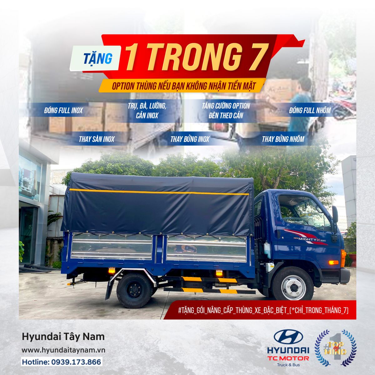 Đặc biệt chỉ có tại Hyundai Tây Nam, chỉ trong tháng 7: “Tặng 1 trong 7 option thùng nếu bạn không nhận tiền mặt.” Giúp bạn nâng cấp thùng an toàn, phù hợp với hàng hoá chuyên chở.
