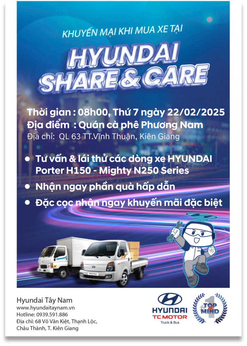 Hyundai Tây Nam hân hạnh giới thiệu sự kiện “HYUNDAI SHARE & CARE” đặc biệt tại thị trấn Vĩnh Thuận. Đây là cơ hội để quý khách trải nghiệm trực tiếp các dòng xe tải tiên tiến của Hyundai và nhận nhiều ưu đãi hấp dẫn.
