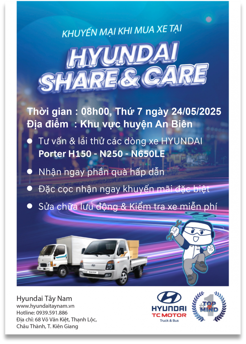 Hyundai Tây Nam trân trọng kính mời Quý khách hàng tại huyện An Biên, Kiên Giang tham gia sự kiện MINI ROADSHOW HYUNDAI diễn ra vào ngày 24/05/2025.