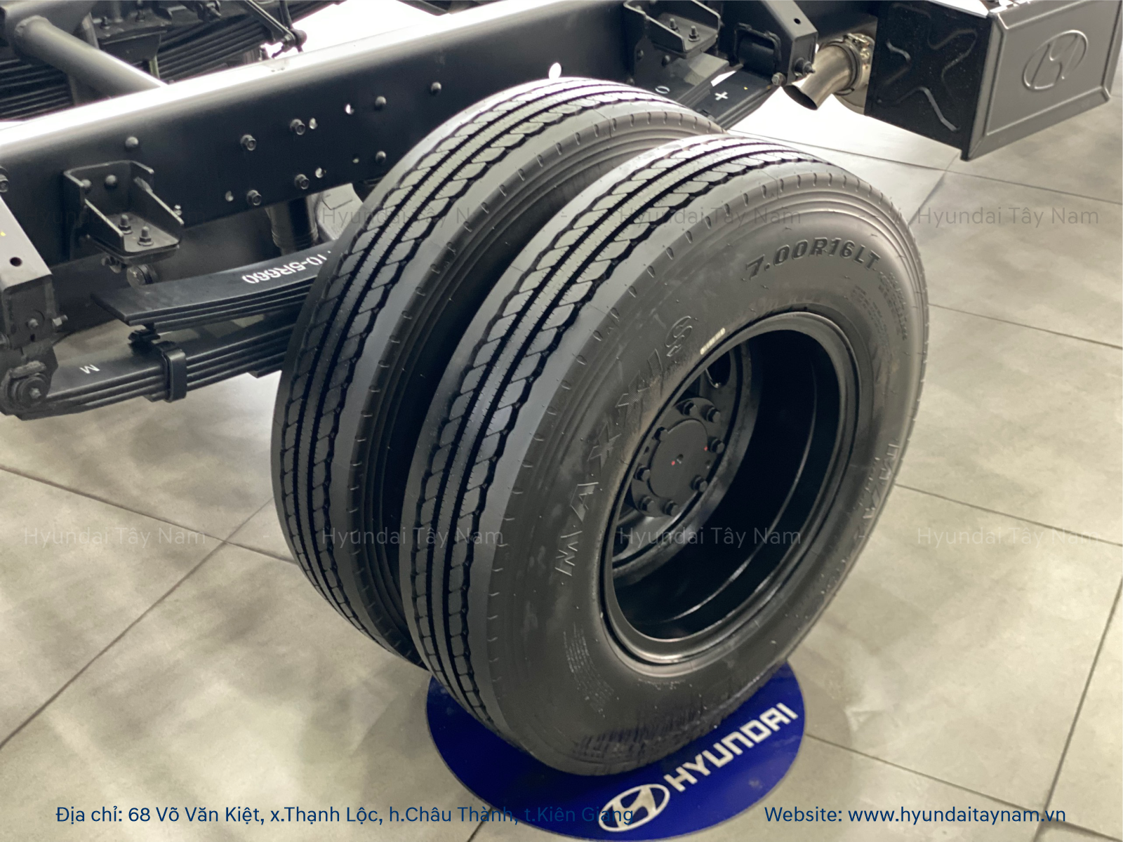 Hyundai N650LE thừa hưởng nền tảng khung gầm từ Hyundai Hàn Quốc với thiết kế dập nguội từ thép cường lực, tăng khả năng chịu tải và chống vặn xoắn. Hệ thống lốp lớn 7.00-R16 đồng bộ, kết hợp cùng hệ thống giảm xóc lá nhíp bán elip 2 tầng, mang lại cảm giác êm ái ngay cả khi xe chở đầy tải.