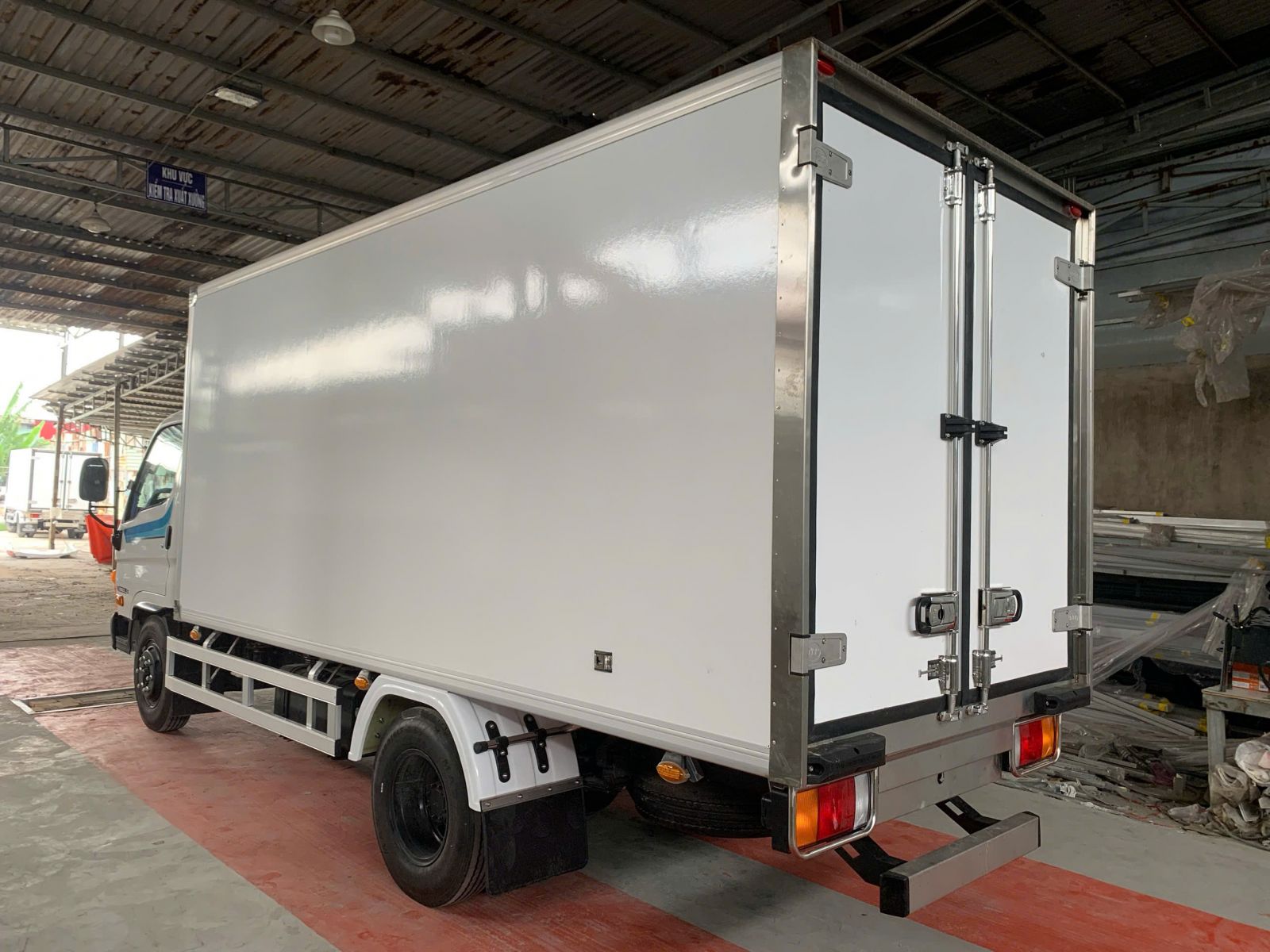 Thùng xe Hyundai N650LE đông lạnh được đóng mới với vật liệu panel composite cách nhiệt PU Foam dày 80mm, cho hiệu quả giữ nhiệt cực tốt. Các chi tiết trong thùng như vách inox, sàn chống trượt, ron cao su kín khít, cửa khóa inox, đều được thiết kế chắc chắn và đạt chuẩn.