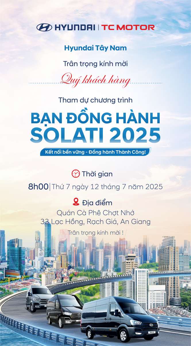 Hyundai Tây Nam trân trọng kính mời quý khách hàng đến tham dự sự kiện "BẠN ĐỒNG HÀNH SOLATI" – cơ hội tuyệt vời để trải nghiệm trực tiếp dòng xe Hyundai Solati 16 chỗ và nhận về những ưu đãi cực hấp dẫn!
