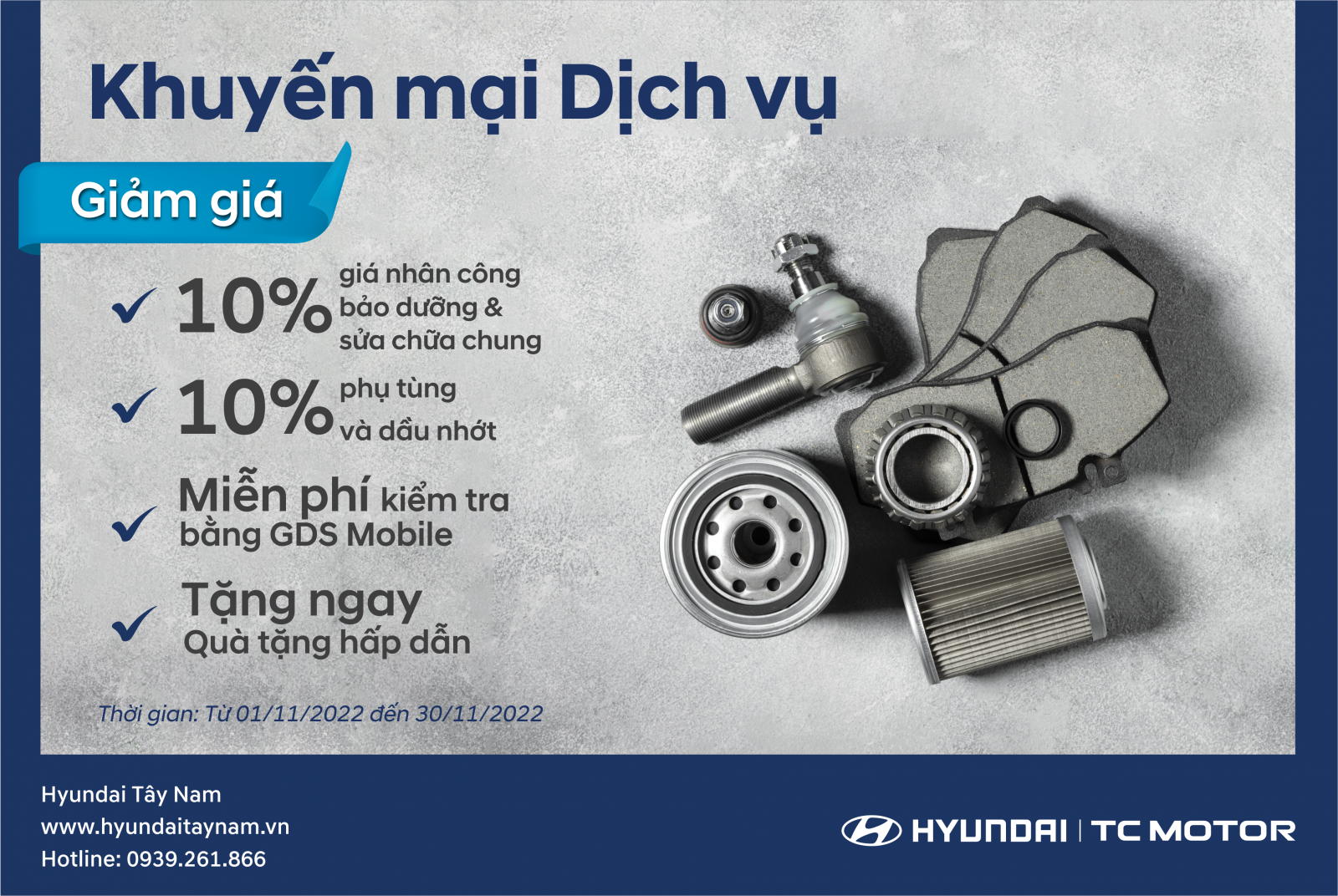 Hyundai Tây Nam xin thông báo tới quý khách hàng chương trình khuyến mại dịch vụ tháng 11-2022 như sau: