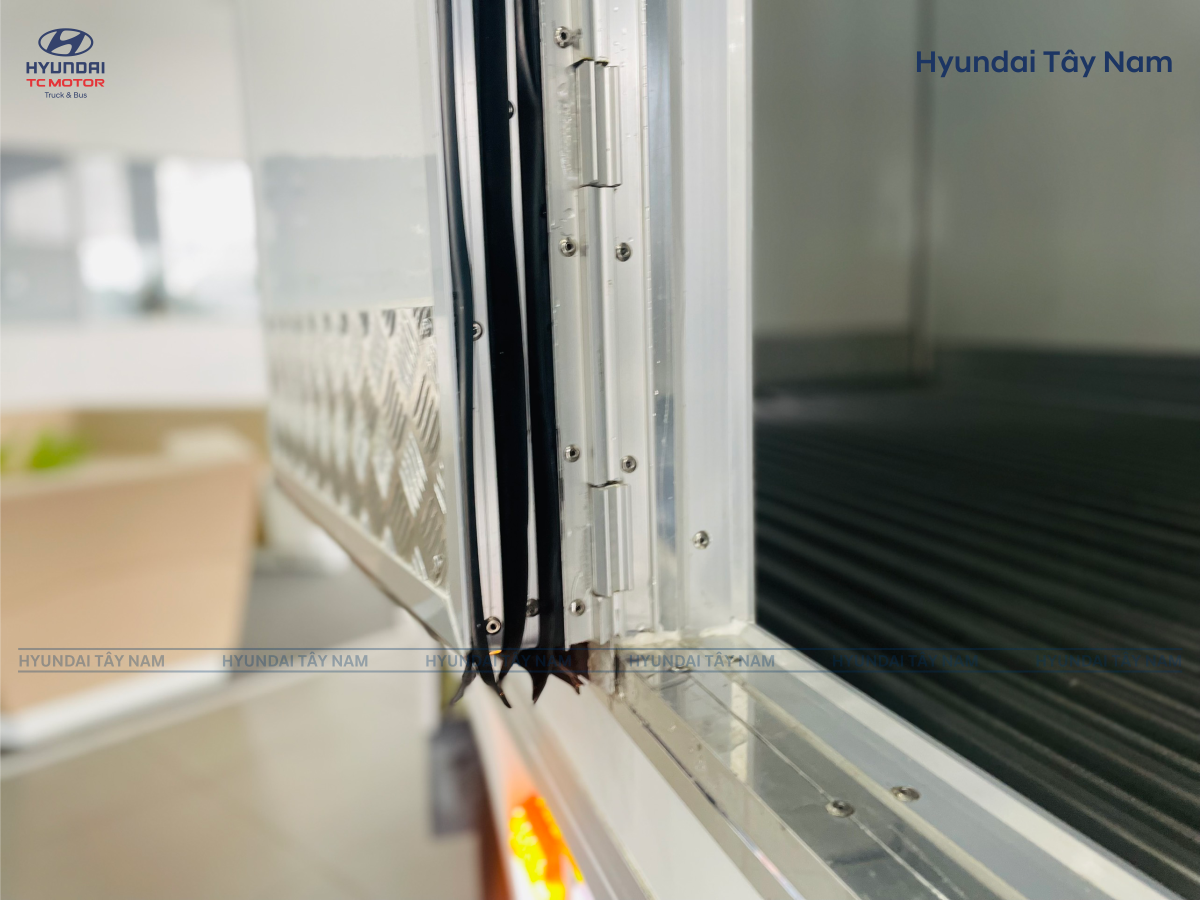 - Cửa thùng đông lạnh: bao gồm cửa sau và cửa hông. Các cánh cửa thường được chế tạo bằng các chất liệu như vỏ thùng (5 lớp). Vị trí liên kết giữa thùng xe với cánh cửa sẽ được gia công thêm gioăng để đảm bảo độ kín và tính thẩm mỹ. Ngoài ra, mỗi cánh sẽ có 3 bản lề làm bằng hợp kim nhôm, khóa cửa bằng tay và khóa hộp inox304 kiểu container.