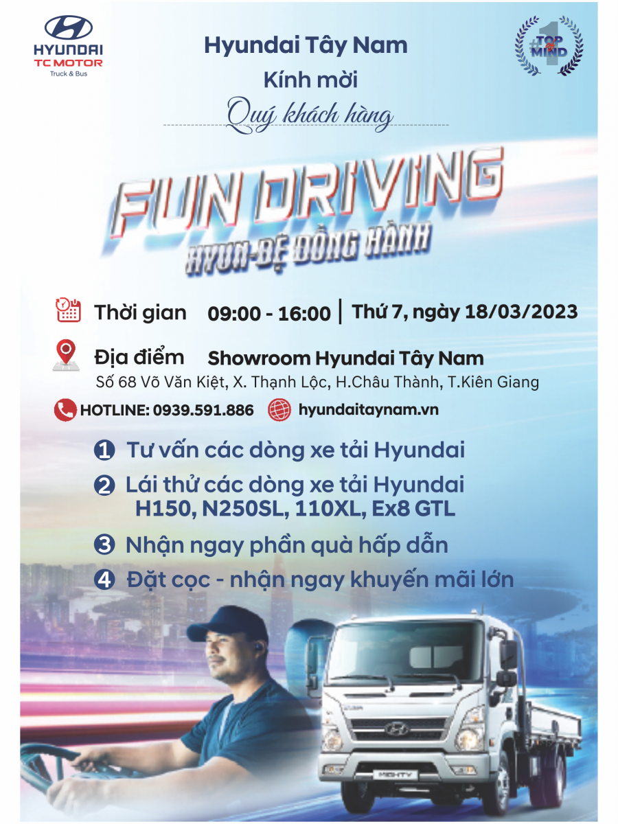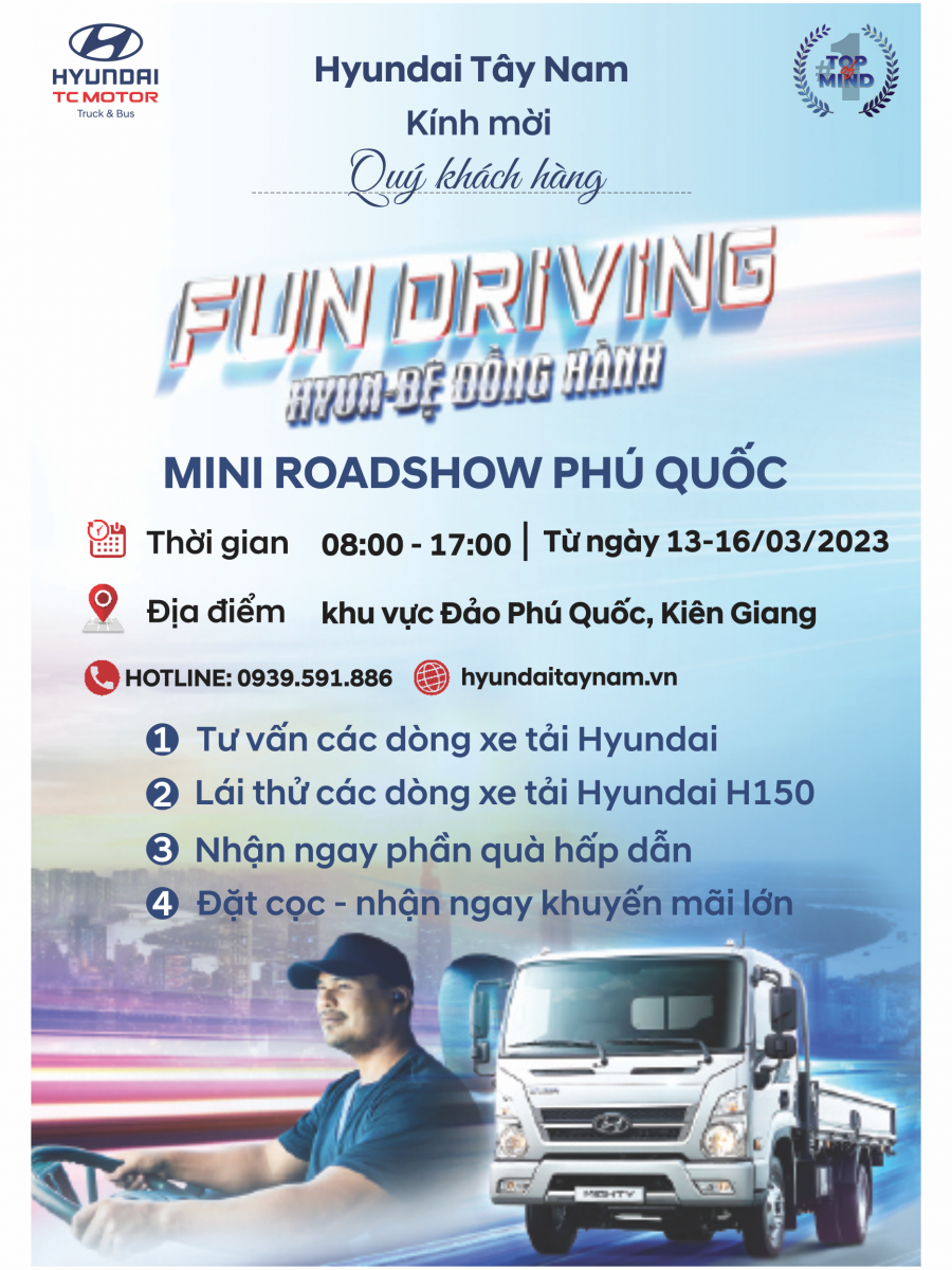 Kính mời quý khách hàng tham dự sự kiện Mini RoadShow & Trưng bày lái thử do đại lý Hyundai Tây Nam tổ chức:. Thông tin - thời gian - địa điểm dưới đây: