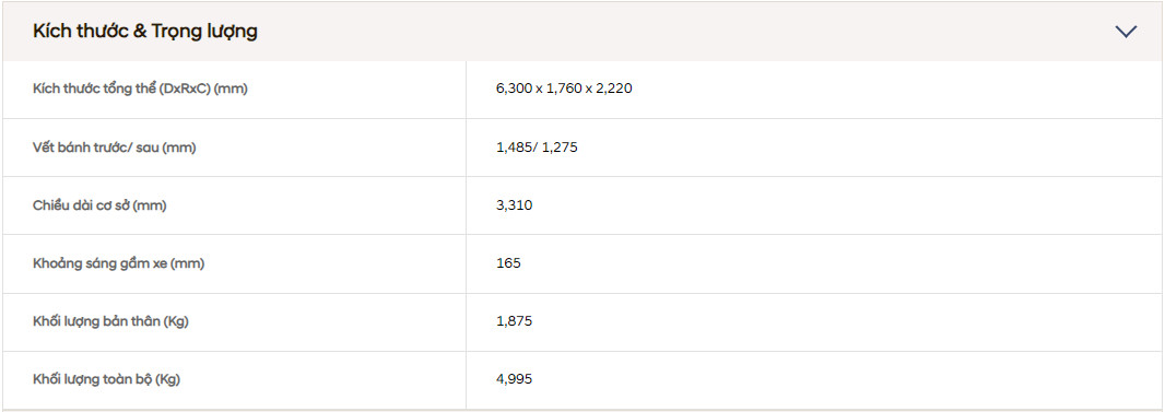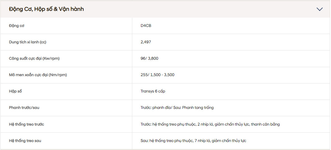 Ðộng cơ D4CB mạnh mẽ cho công suất cực đại 130ps / 3,800 rpm. Kết hợp với hộp số 6 cấp cho hiệu quả truyền động cao và độ bên cực tốt.