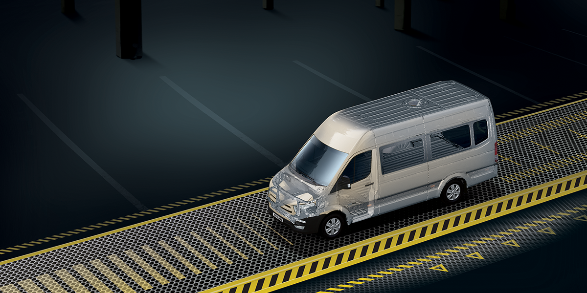 Để bảo vệ hành khách một cách tối đa, 80% khung xe Hyundai Solati được làm từ thép cao cấp theo tiêu chuẩn Hyundai toàn cầu, thiết kế theo cấu trúc vòng quay kín, tăng độ vững chắc, ổn định và an toàn.