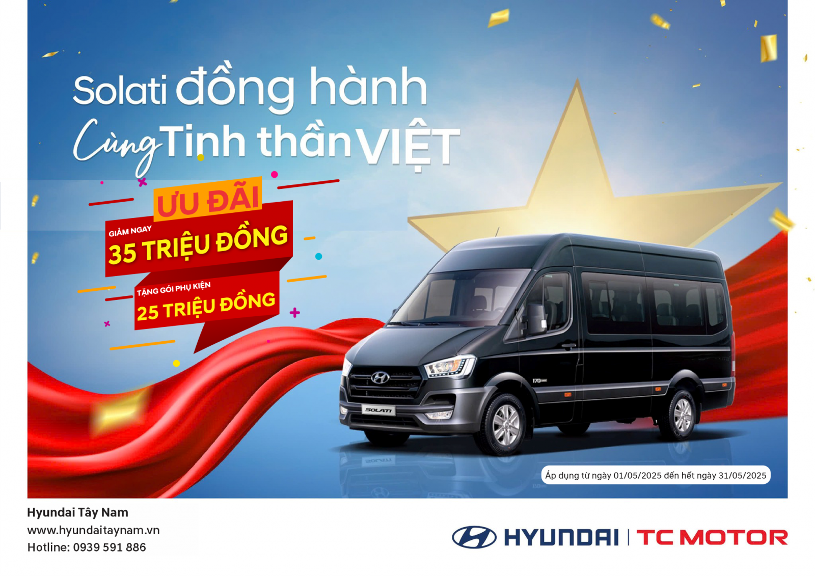 Hyundai Solati mang lại một làn gió mới cho thị trường xe thương mại Việt Nam đặc biệt là phân khúc xe khách dưới 16 chỗ. Hyundai Solati đã trải qua hàng triệu số Km thử nghiệm để đảm bảo vận hành tốt nhất trong các điều kiện khí hậu và địa hình khác nhau. Thiết kế sang trọng và đẳng cấp tạo nên sự khác biệt trên đường phố. Sức mạnh và chất lượng vượt trội vượt qua mọi thử thách. Công nghệ tiên tiến mang đến sự an toàn, thoải mái và đầy phấn khích cho người sử dụng.