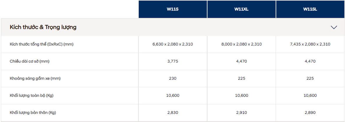 Hyundai Mighty W11 Series là giải pháp vận tải toàn diện với tính linh hoạt cao và khả năng tiết kiệm chi phí tối ưu. Xe được trang bị động cơ tiêu chuẩn Euro 5, không cần sử dụng Ure, vừa đảm bảo tiêu chuẩn khí thải nghiêm ngặt vừa bảo vệ môi trường, đồng thời vẫn duy trì khả năng tiết kiệm nhiên liệu vượt trội. Với ưu điểm về độ an toàn và độ tin cậy, dòng xe này là sự lựa chọn hoàn hảo cho mọi hoạt động vận chuyển. Ba phiên bản Mighty W11S, Mighty W11SL và Mighty W11XL, với kích thước thùng xe khác nhau, cho phép chở nhiều loại hàng hóa hơn, nâng cao hiệu quả làm việc và đáp ứng tốt các nhu cầu đa dạng của khách hàng.